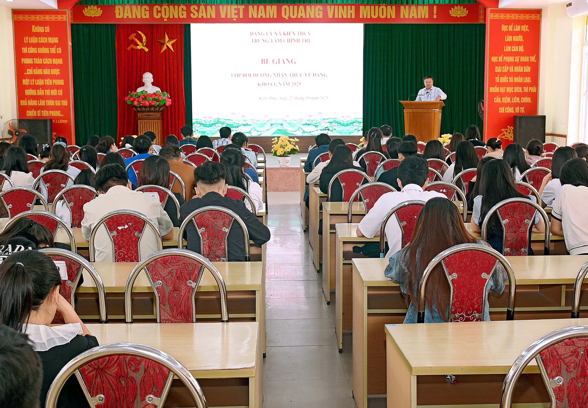 Phát biểu tại Lễ Bế giảng, đồng chí Phạm Quang Vũ- ĐUV, Giám đốc Trung tâm Chính trị xã Kiến Thụy đã chúc mừng, biểu dương và ghi nhận những cố gắng trong học tập của các học viên, đồng thời nhấn mạnh: Lớp bồi dưỡng nhận thức về Đảng góp phần bồi dưỡng những kiến thức chính trị bước đầu nhằm giúp cho mỗi học viên có nhận thức đúng về Đảng, về con đường, phương hướng phấn đấu để trở thành người Đảng viên Đảng Cộng sản Việt Nam. Đồng chí mong rằng các học viên sau khi tham gia lớp học phải tiếp tục phát huy hơn nữa tinh thần tự học tập, tự nghiên cứu, không ngừng nâng cao trình độ về lý luận chính trị, chuyên môn nghiệp vụ, đồng thời thường xuyên học tập và làm theo tư tưởng, đạo đức, phong cách Hồ Chí Minh; để phấn đấu được đứng trong hàng ngũ của Đảng trong thời gian sớm nhất.