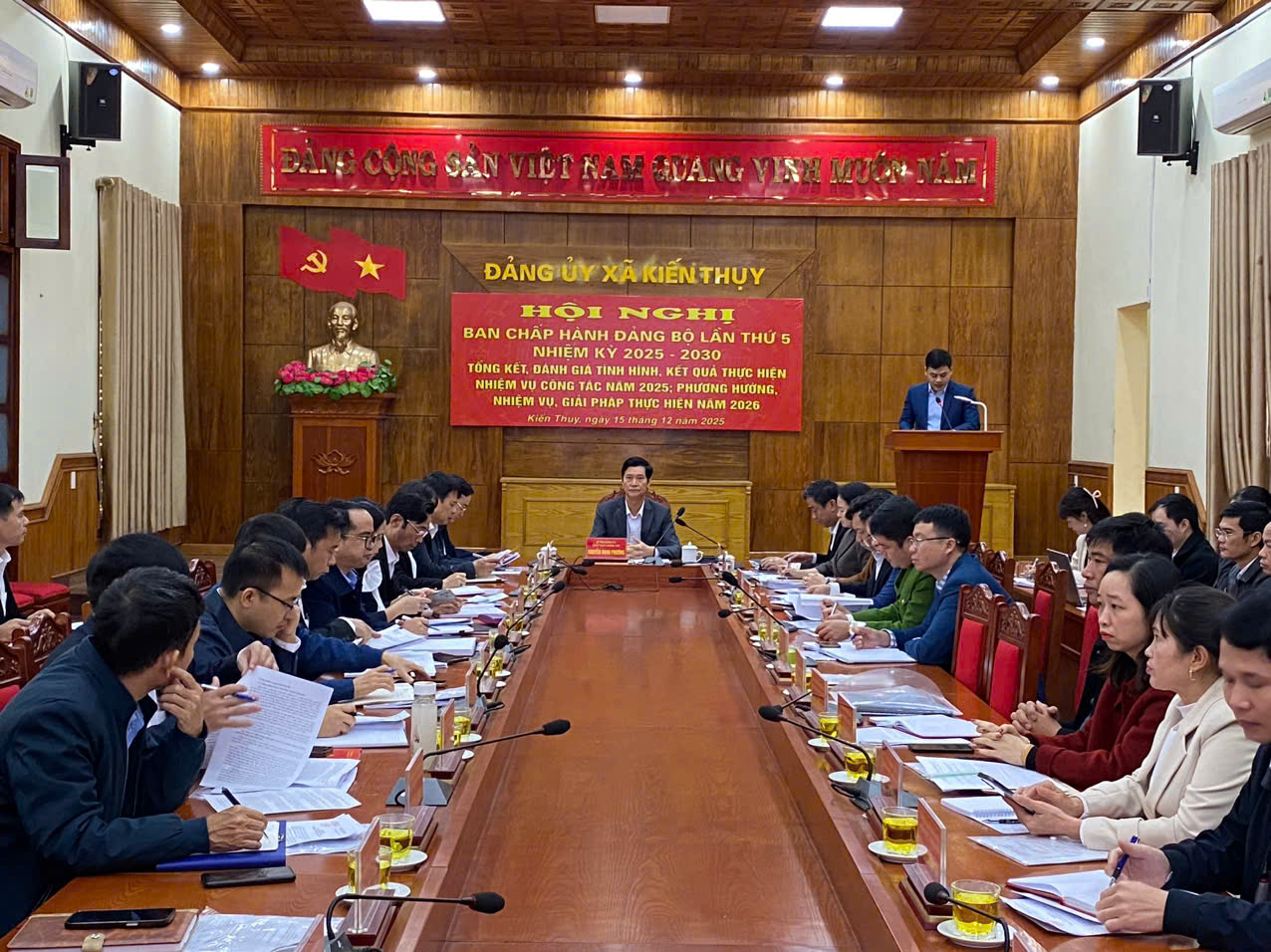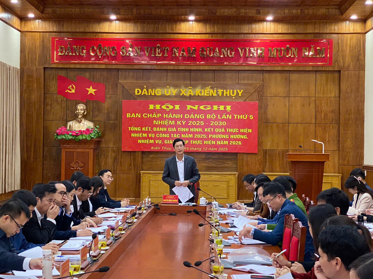 Sáng ngày 15/12/2025, Ban Thường vụ Đảng ủy xã Kiến Thụy tổ chức Hội nghị Ban Chấp hành Đảng bộ xã lần thứ 5 nhằm tổng kết, đánh giá kết quả thực hiện nhiệm vụ công tác năm 2025; thảo luận phương hướng, nhiệm vụ và giải pháp thực hiện năm 2026.