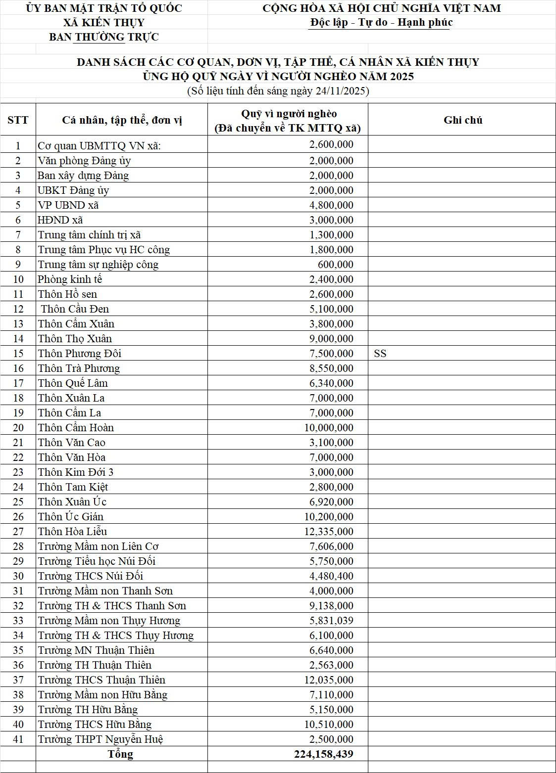 Tính đến sáng ngày 24/11/2025, tổng số tiền các tập thể, cá nhân, cơ quan, đơn vị trong xã đã ủng hộ đạt 224.158.439 đồng (chuyển về tài khoản Ủy ban MTTQ Việt Nam xã).