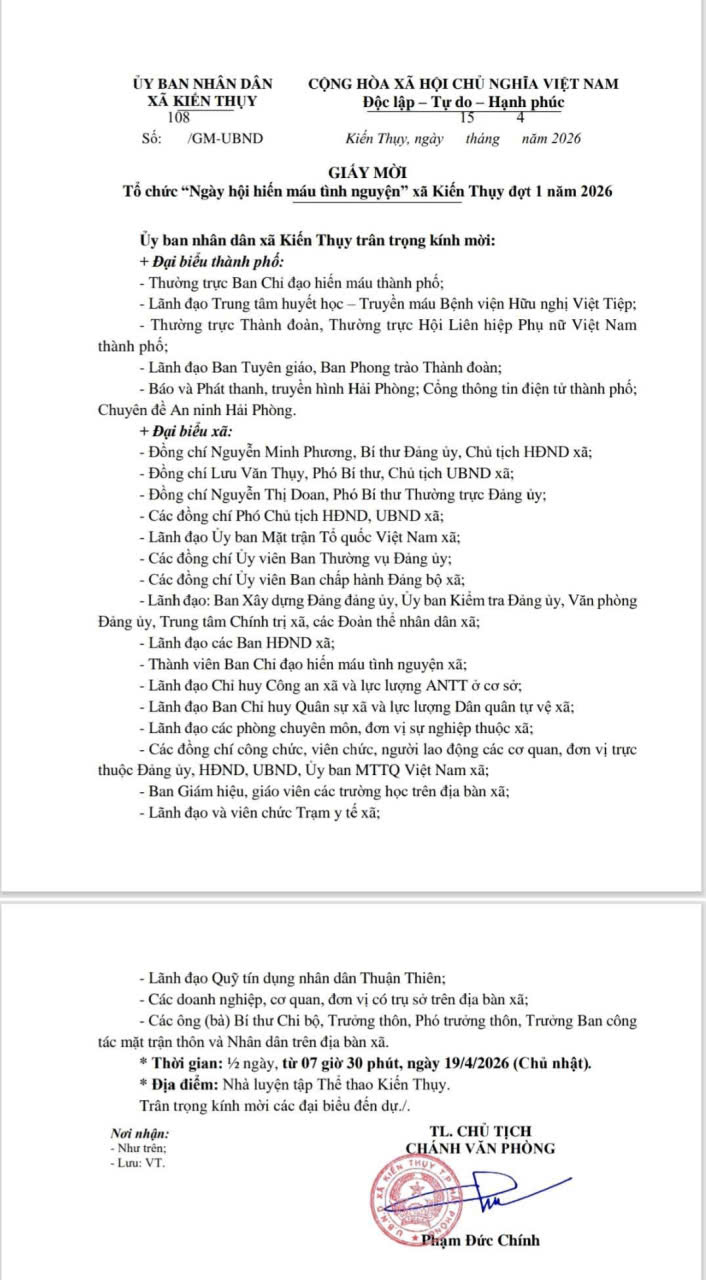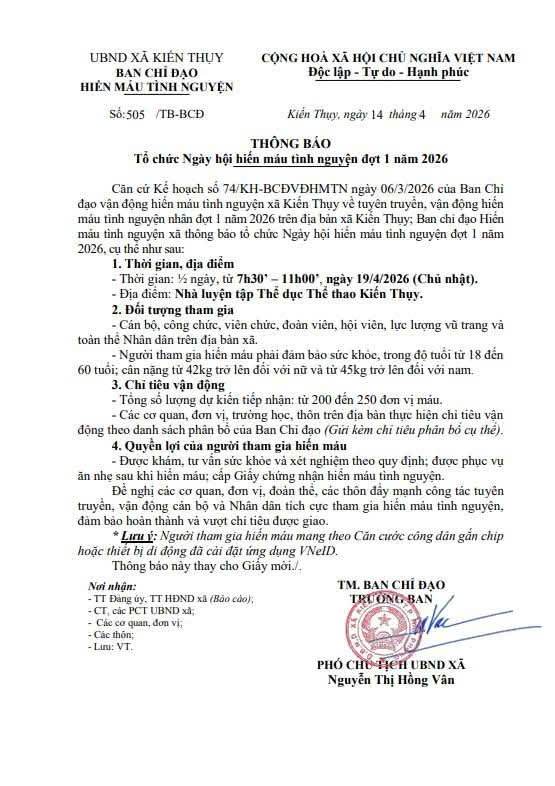 Thực hiện Kế hoạch của Ban Chỉ đạo vận động hiến máu tình nguyện xã Kiến Thụy, Ngày hội hiến máu tình nguyện đợt 1 năm 2026 sẽ được tổ chức nhằm lan tỏa nghĩa cử cao đẹp, góp phần cứu chữa người bệnh và chung tay vì sức khỏe cộng đồng.