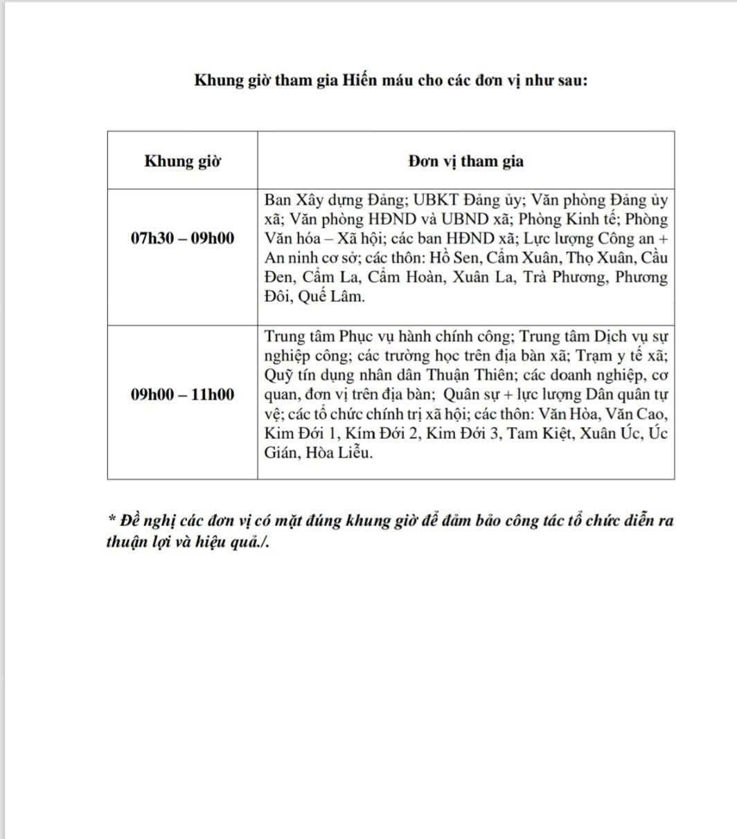 Đối tượng tham gia: Cán bộ, công chức, viên chức, đoàn viên, hội viên, lực lượng vũ trang và toàn thể Nhân dân trên địa bàn xã có đủ điều kiện sức khỏe (từ 18 đến 60 tuổi; cân nặng từ 42kg đối với nữ, 45kg đối với nam trở lên). Ngày hội dự kiến tiếp nhận từ 200 đến 250 đơn vị máu, với sự tham gia của các cơ quan, đơn vị, trường học và các thôn trên địa bàn theo chỉ tiêu được giao.