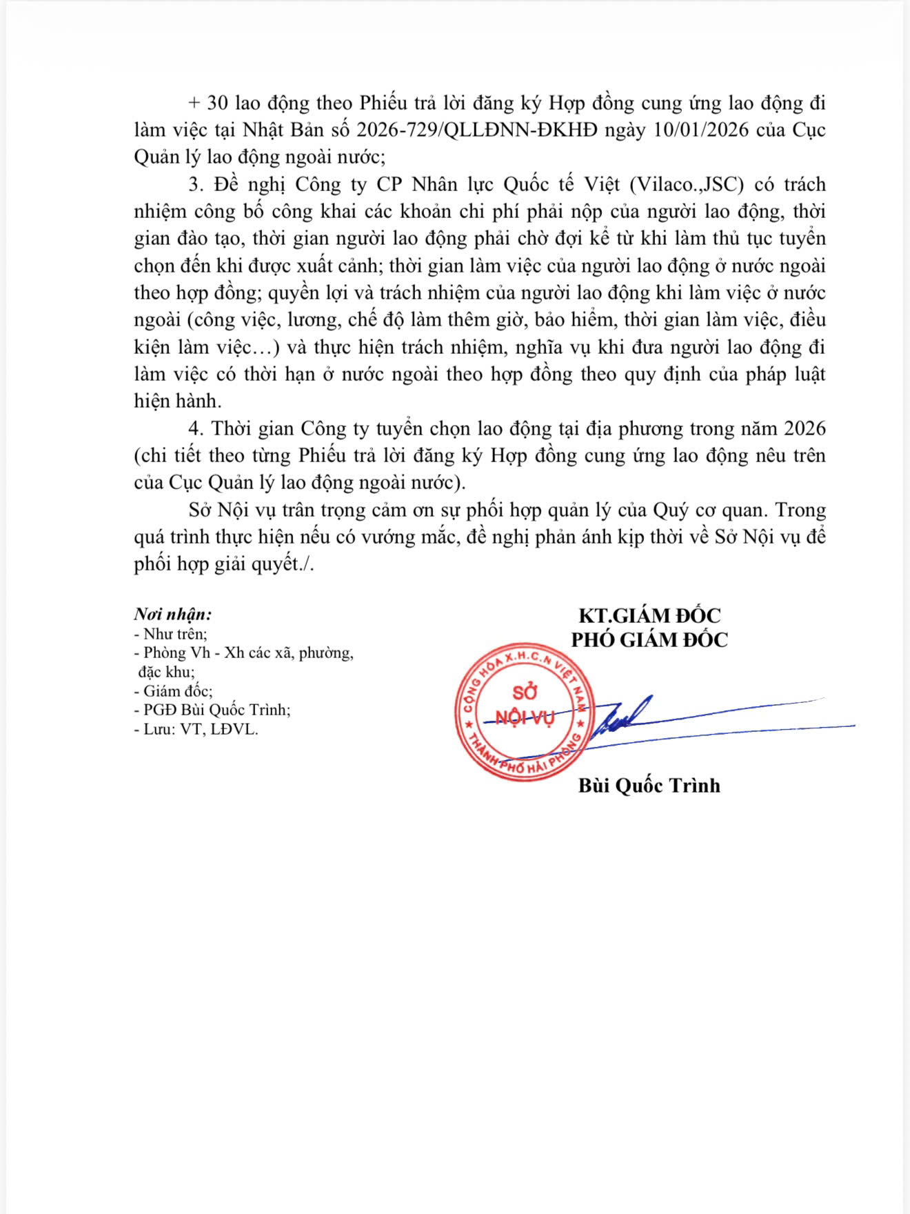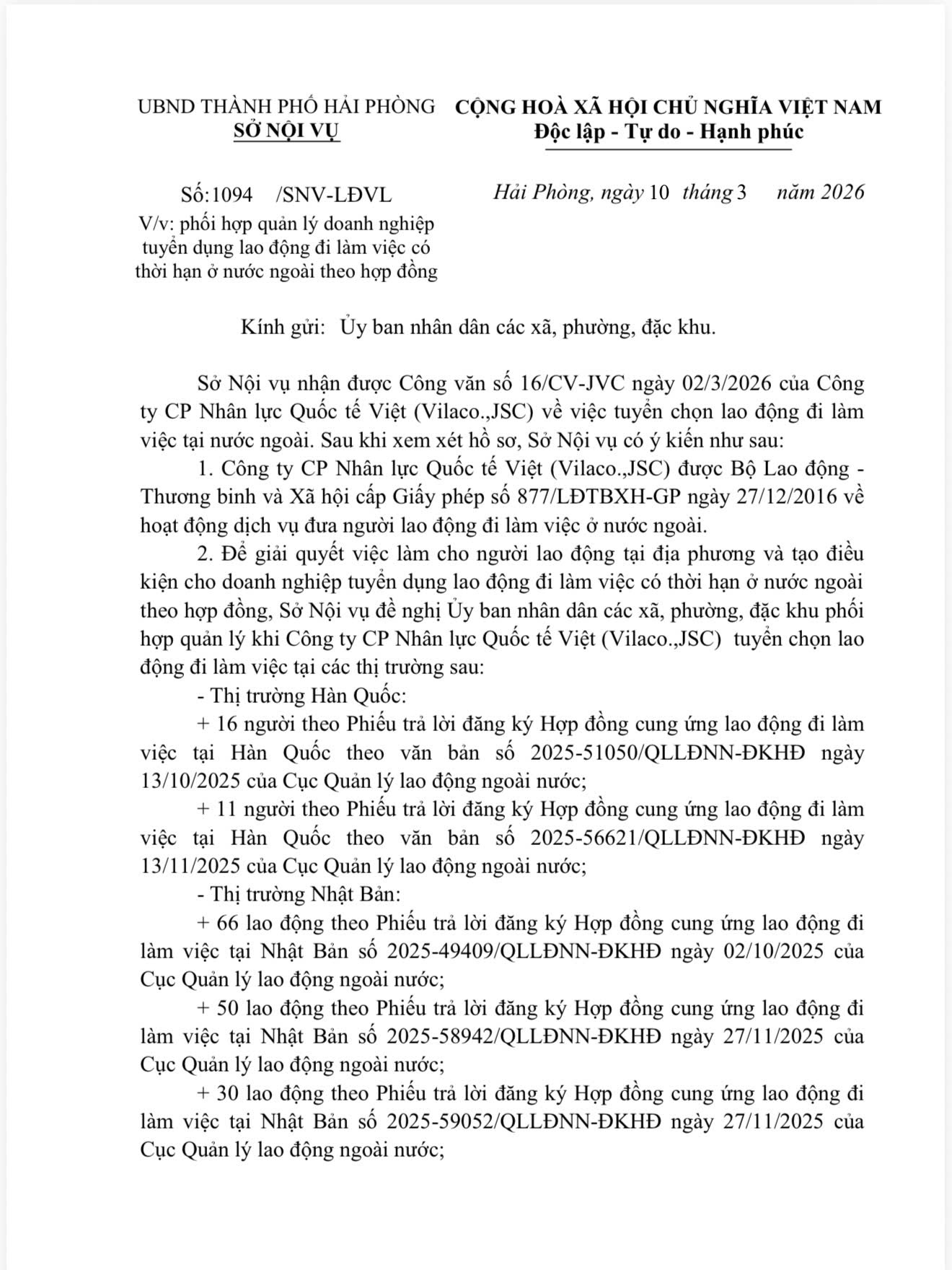 Thực hiện công văn số 1094, ngày 10/3/2026 của Sở Nội Vụ thành phố Hải Phòng, hiện nay Công ty Cổ phần Nhân lực Quốc tế Việt tuyển dụng gấp 50 lao động đi làm việc có thời hạn tại Hàn Quốc với những điều kiện cụ thể như sau: